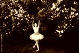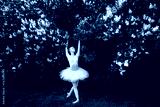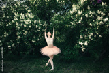 Ballerina dancing outdoors classic ballet poses in flowers landscape