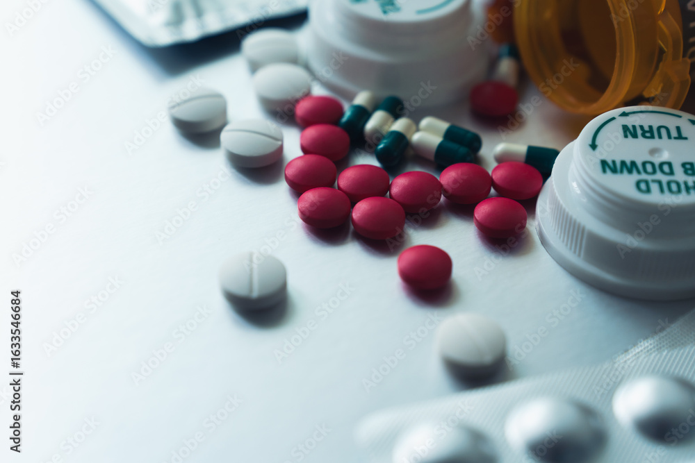 Medicine bottle and pill with blister packaging used in pharmacy and health care. Ideal of drug treatment, supplement or vitamin and pharmaceutical marketing and industry. Healthcare concept