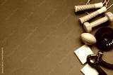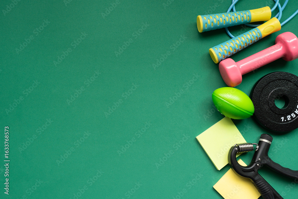 Time for exercising sport equipment on the green table background, healthy and workout concept