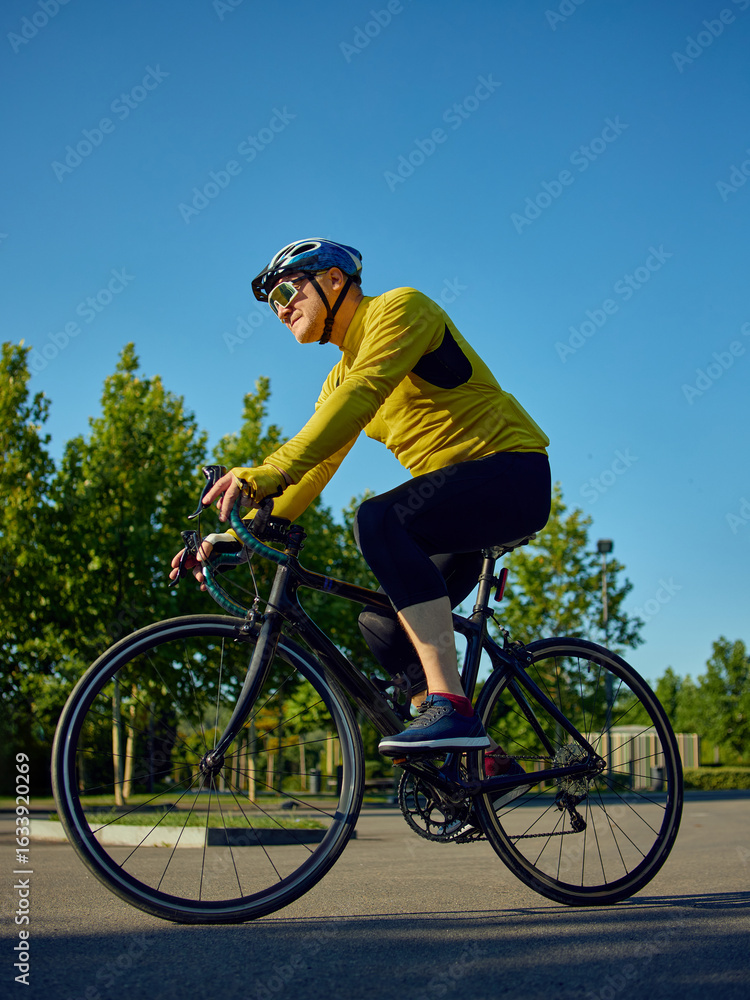 Focused senior cyclist riding road bike in urban park on clear sunny morning. Concept of healthy routine, fitness habit, endurance building, outdoor lifestyle for mature adults.