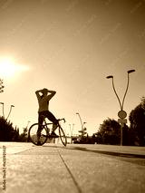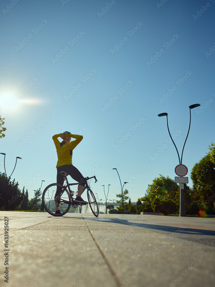 Man in yellow cycling outfit stretching arms while standing with road bike. Concept of post-ride relief, urban recreation, flexibility, morning sports habits, healthy aging.