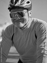 Close-up of older man smiling with bike helmet and sunglasses. Concept of sports enthusiasm, wellness branding, active retirement visuals, and health campaign materials.