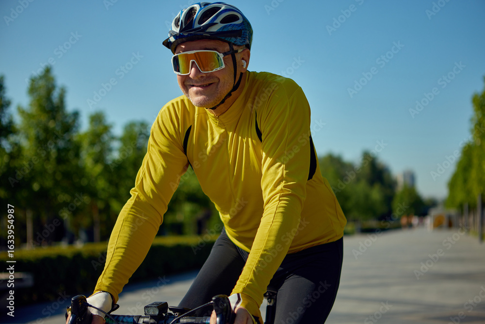 Smiling senior man cycling in city park with helmet and glasses. Concept of outdoor health, aging well, city sports, cycling promotion, and vitality in later life.