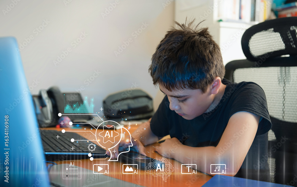 Teen boy using AI chatbot on smartphone search for music educational by digital device at home,Concept digital native children,screen time awareness,hybrid learning with artificial intelligence