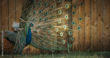 peacock fluffs up his tail and dances in front of the female. Indian Peacock Has Iridescent Blue And Green Plumage. Indian Peafowl Walk Outdoor. All Species Have Crest Atop Head. Pavo Cristatus, Blue