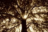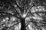 Huge old plane tree seen from below in contrasting shades of gray. The sun peeks through the dense canopy. Symmetrical perspective with numerous delicate branches and leaves in summer. Black and white