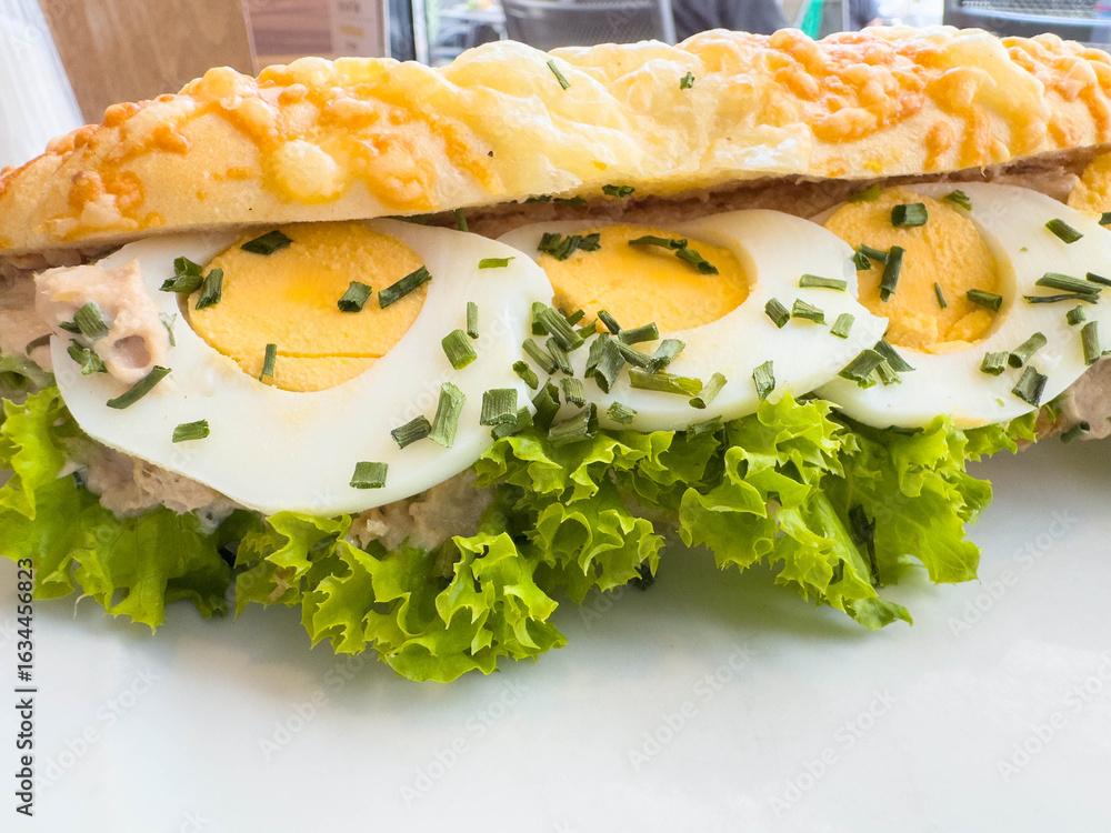 Egg and tuna sandwich with cheese bread and fresh lettuce garnish close-up view