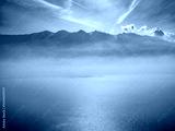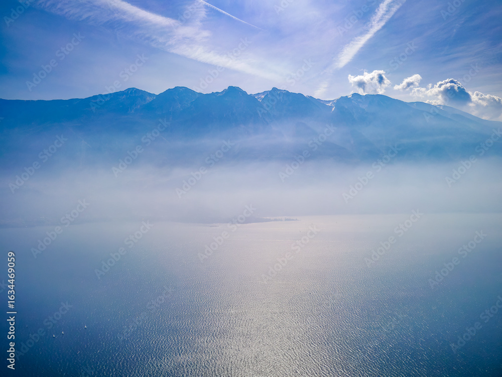 View of Monte Baldo and Lake Garda shrouded in mist from Tremosine.
