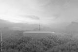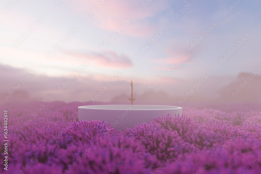 Outdoor bathroom in lavender field. Luxury modern bathtub in purple flower landscape. Surreal interior design and creative biophilic architecture. Aesthetic wellness, spa and body care concept.