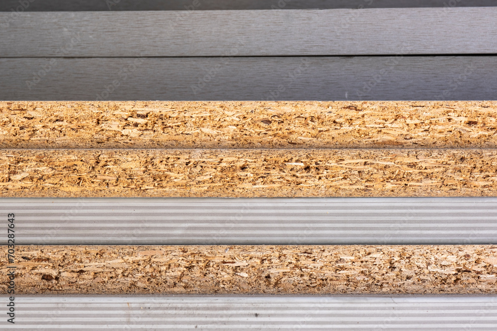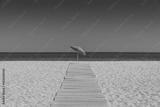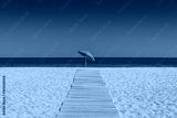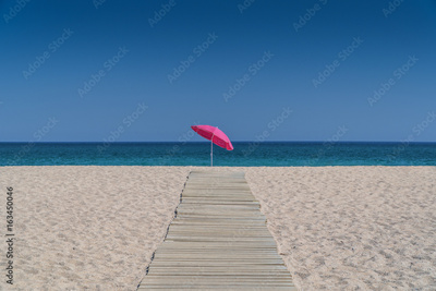 Sun umbrella standing alone at the end of a wooden pavement on an empty sandy beach with crystal clear sea waters in background