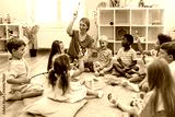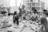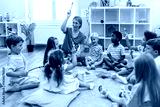 Preschool teacher leading a fun interactive activity with children sitting in a circle, raising hands and smiling in a bright classroom