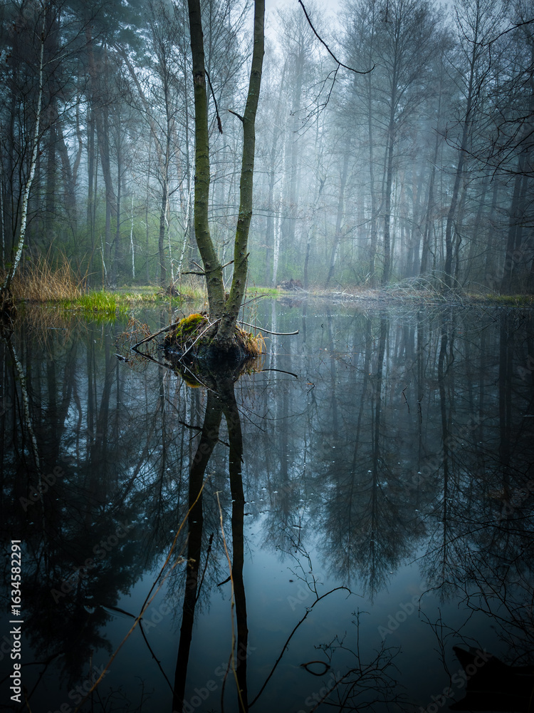 Tree growing in a swamp. Dark natural background. Picturesque view of green forest with swamp.