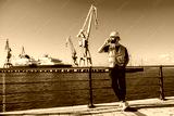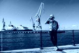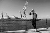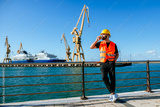 Dock worker drinking coffee enjoying break in front of cargo ship and cranes