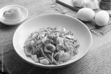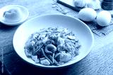 Stir fried Glass Noodles With Salted Egg and Pickled mustard green in white plate.