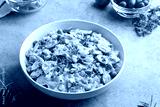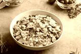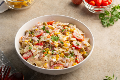 Homemade macaroni salad with bow tie pasta and canned tuna, carrot, onion, corn, tomato, green peas and mayonnaise dressing in a white plate on wooden table.