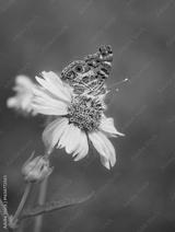 American Lady butterfly (Vanessa virginiensis) feeding on Golden Crownbeard flower in the garden. Natural green background with copy space.