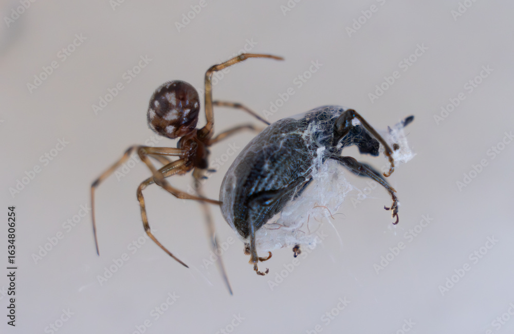 Spider Preying on Insect in Its Web, close-up image showcases a spider capturing its prey, emphasizing a predator-prey relationship and the intricacies of nature's food chain in a captivating manner