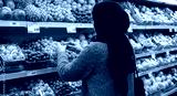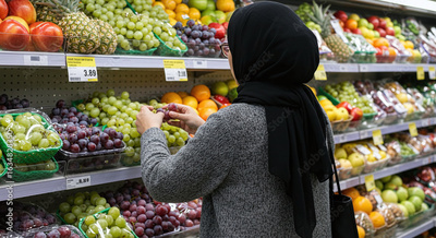 Woman in hijab selecting fresh fruit in a supermarket aisle with vibrant colors, retail shopping, healthy lifestyle, groceries, diversity, muslim consumer.