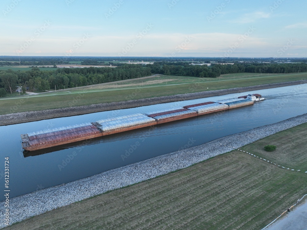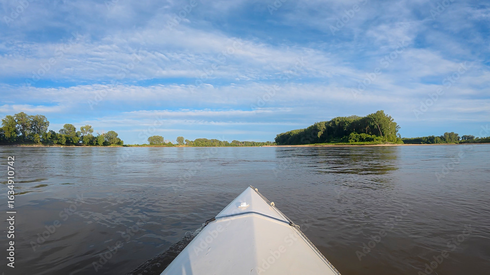 kayaking or canoeing on the Missouri River in Missouri, approaching Hills Island below Waverly - POV paddler perspective
