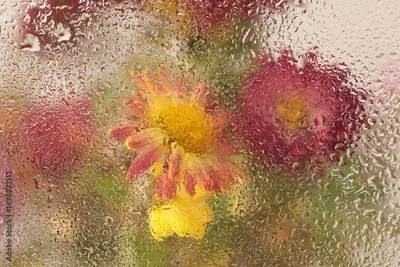 Smoke soft focus red, yellow aster, chrysanthemum Flower bouquet through glass with wet water drops. Abstract natural blur background.