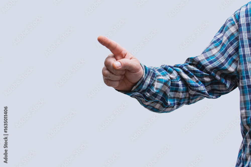Concept of pointing finger. Close-up of a man in a shirt pointing his finger forward on the light background.