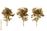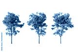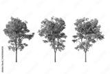 Three green deciduous trees standing isolated on a pure white background, ready for architectural visualization and graphic design projects