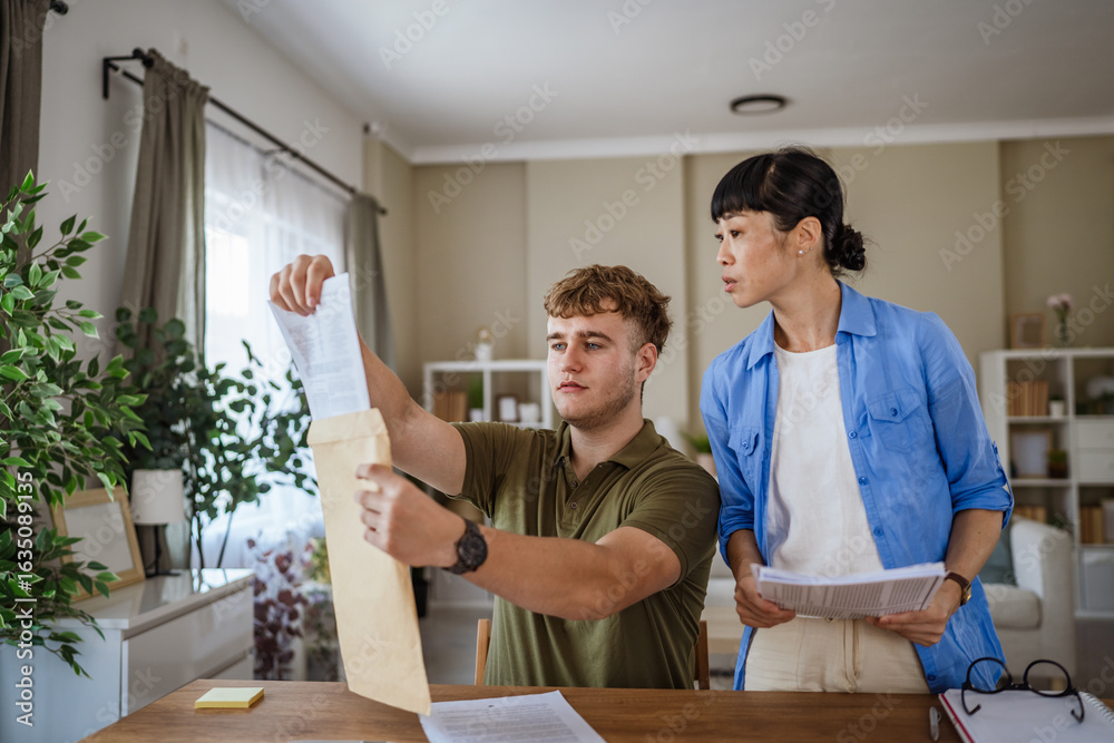 Young man and woman reading important documents at home