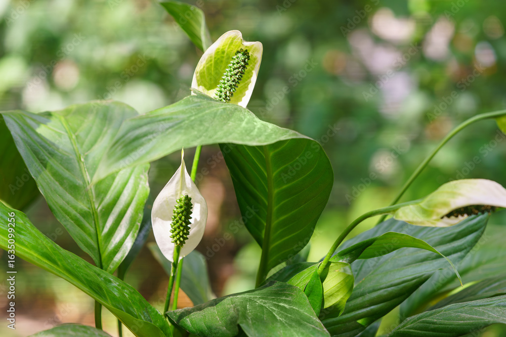 Closeup, macro of blooming white Spathiphyllum kochii flowers with vibrant green leaves under soft natural sunlight in a lush garden background. Gardeing, plant breeding, flowering hobby