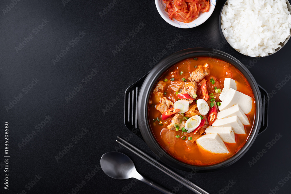 Top view of Korean food (Kimchi Jjigae), Kimchi soup with tofu, pork, scallion and chili in Korean stone bowl eating with cooked rice and kimchi cabbage on black background