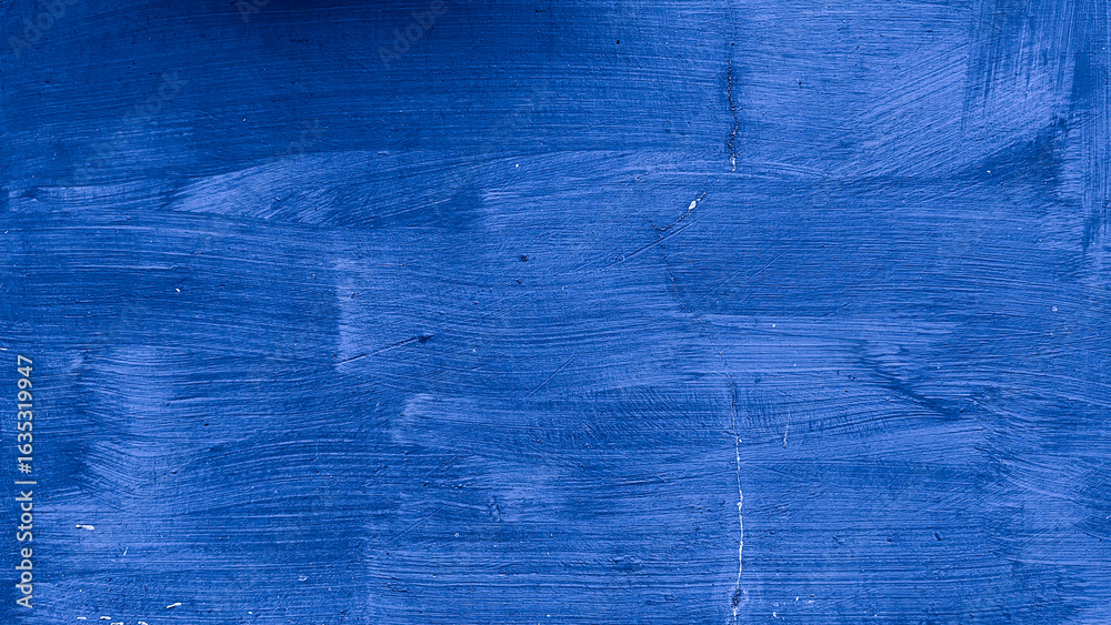 Close-up of blue painted wall with visible brush strokes, cracks, and subtle imperfections on the surface.