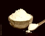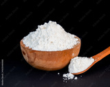 wooden spoon and bowl with white rice flour on a black background