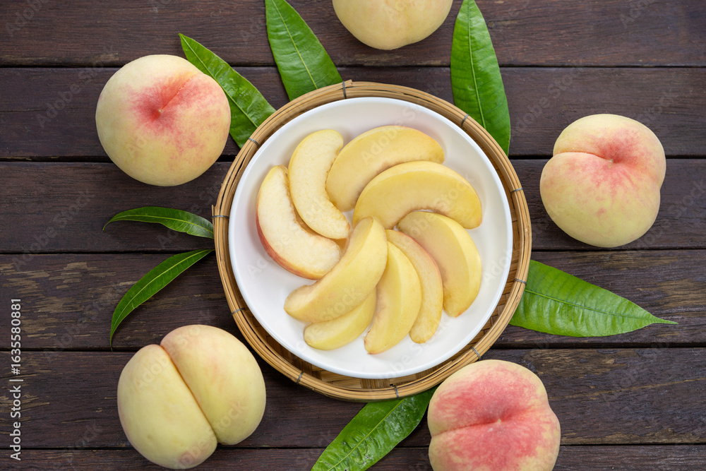 White Peaches with leaves in white plate on the wooden table, Fresh White Peach on white plate in wooden Background.