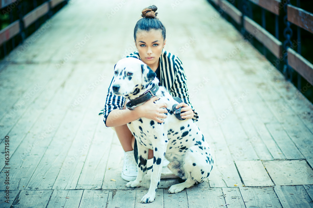 Man's best friend. Woman with dalmatian dog on the bridge posing.