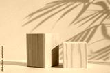Wooden cube-shaped scenes with the shadow of tropical palm leaves on a beige background. A premium geometric podium for advertising your product. Showcase, display case.