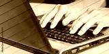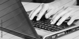 Hands typing on a laptop keyboard, geometric pattern