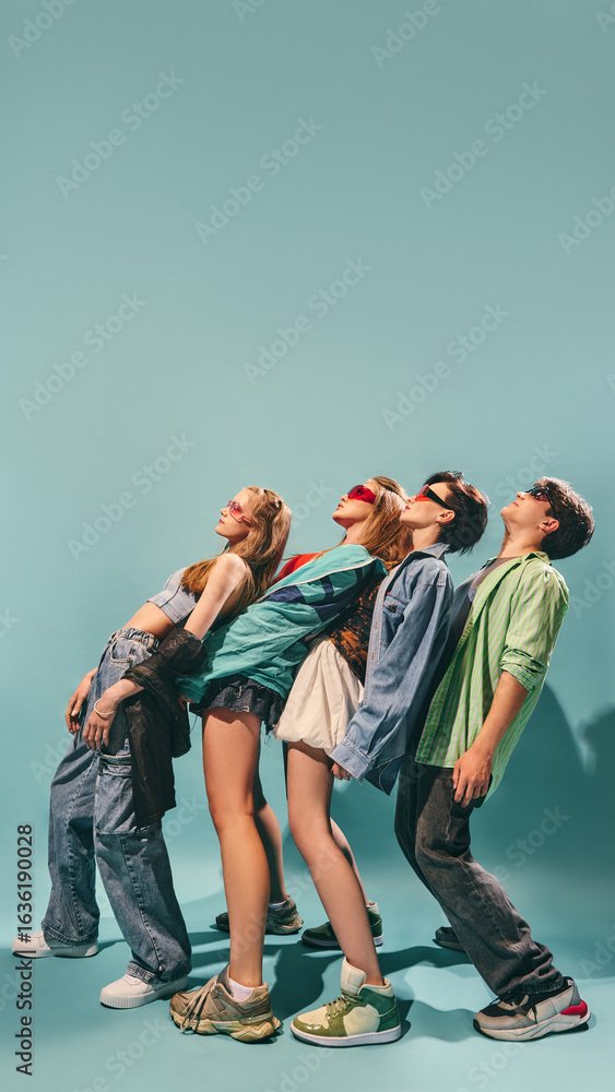 Stylish group of young adults leaning back together in coordinated streetwear on blue background. Concept of youth style, subculture fashion, creative branding, and music platform visuals.
