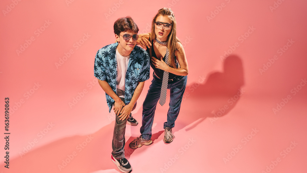 Stylish Gen Z friends posing in retro-inspired streetwear on pink background. Concept of youth fashion, streetwear culture, pop culture, event promo, and creative branding.