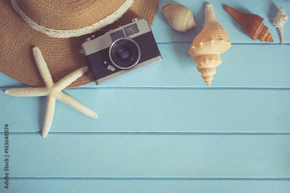 Top view. camera and shells on the wooden floor of the blue, summer concept, retro filter