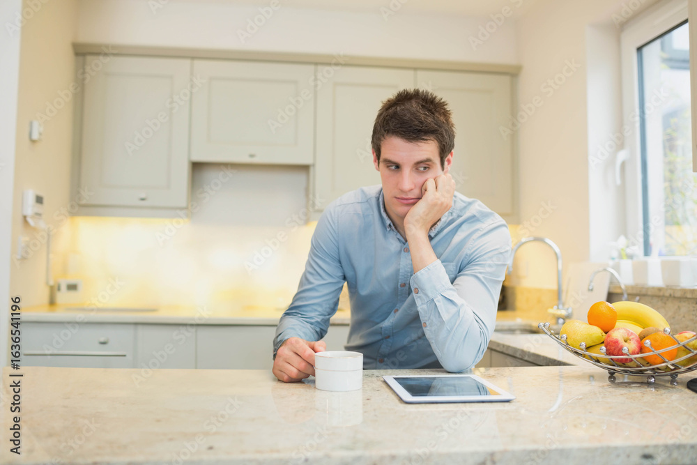 Man resting elbow on marble countertop in home kitchen, gazing while gripping mug beside tablet
