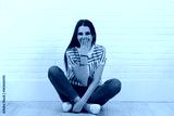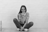 Laughing young woman covering mouth, sitting cross-legged on floor, against white brick wall. Striped shirt, jeans. Positive human emotion facial expression feeling.
