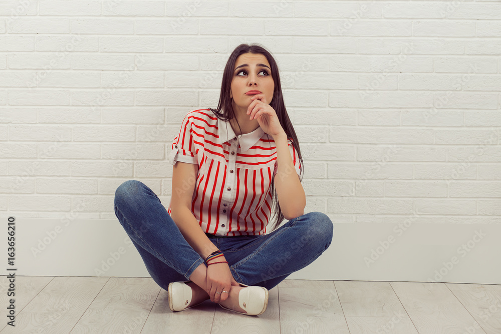 Thinking young woman sitting cross-legged, looking up, isolated white brick wall background. Striped shirt, jeans. Neutral human emotion facial expression feeling.