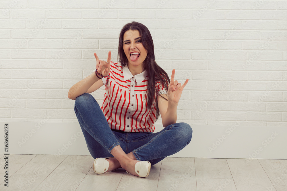 Funny young woman sat cross-legged on floor, gesturing heavy metal. Isolated white brick wall background. Facial expression feeling symbol, body language, non verbal communication