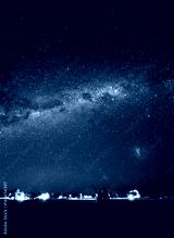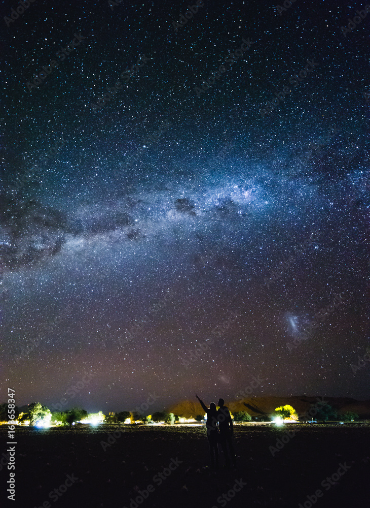 Couple pointing to the galaxy at the sky. Milky Way over Sesriem camping site, Namibia.