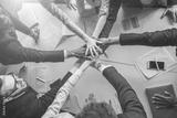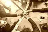 Unity concept. Close-up of people holding hands together while sitting around the desk