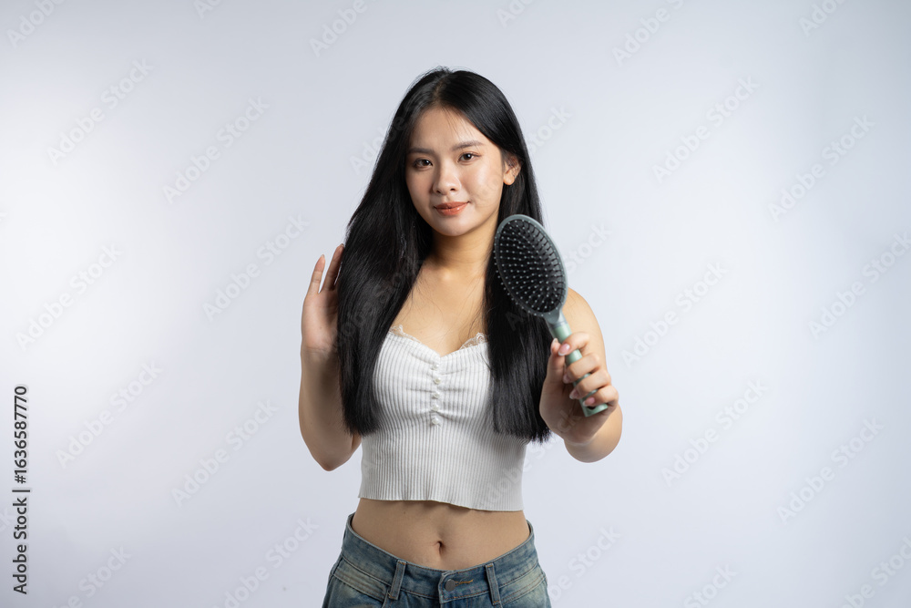 Woman with long dark hair holding a hairbrush in front of a white background smiling slightly