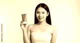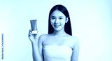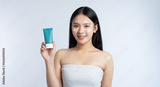 Smiling woman with skincare cream application on face tube of product in hand light backdrop