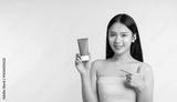A woman with clear skin and a bright smile promotes a skincare product in a tube on a white backdrop
