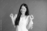 Smiling woman in white dress enjoys a moment of happiness against bright blue background