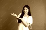 Smiling woman presenting with open hands against a bright blue backdrop Simple and effective