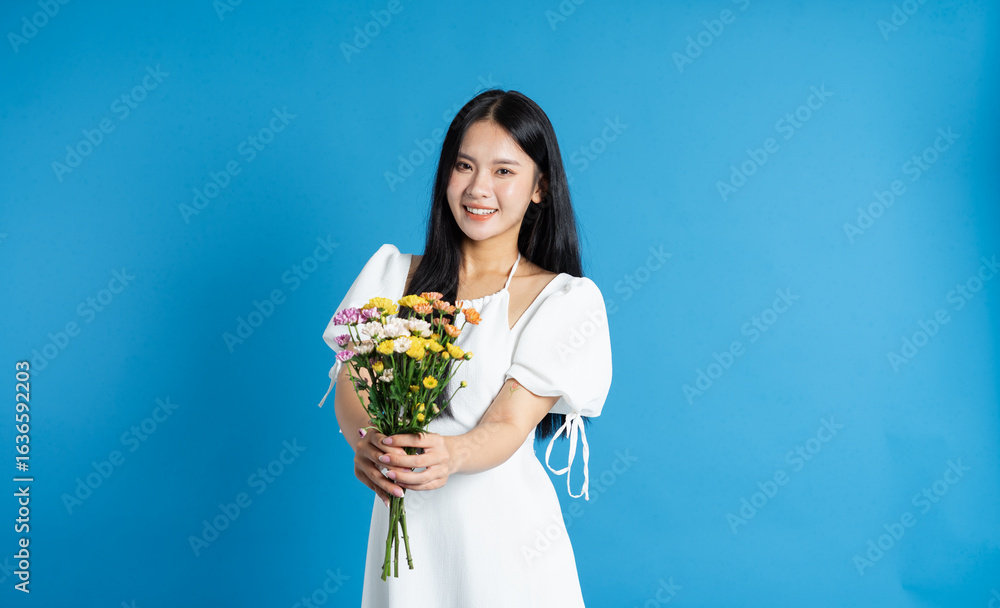 Smiling woman in a white dress holding a bunch of colorful flowers against a solid blue background